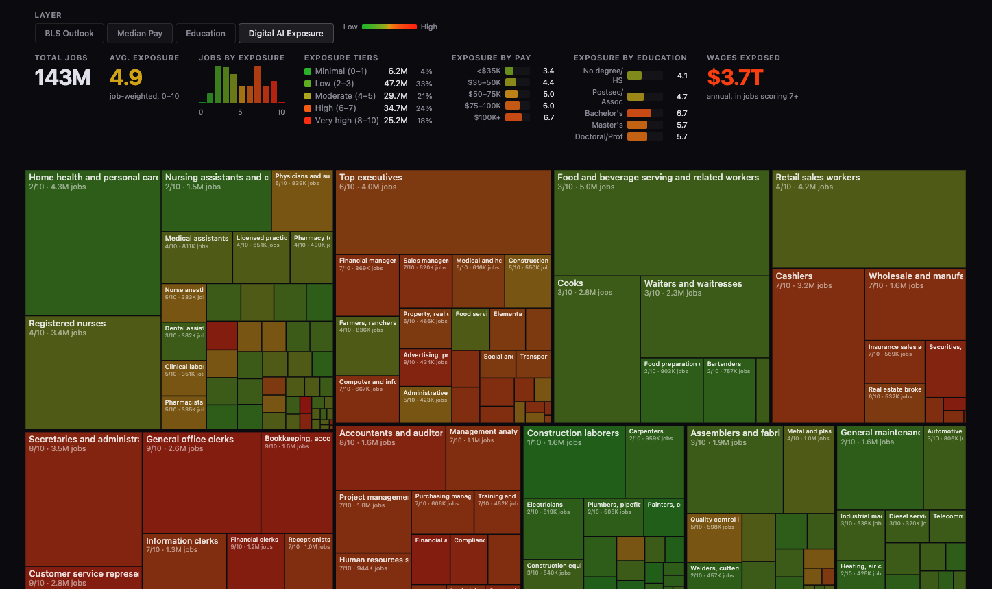 В прошлом выпуске я жаловался, что моя работа аналитиком поменялась кардинально и скоро будет совсем не нужна. Там, где раньше нанимали 10 аналитиков, будет нужен один. Попалась занятная аналитика от Карпатого (данные от бюро трудоустройства США, приправленные LLM) — где красное, там бахнет: