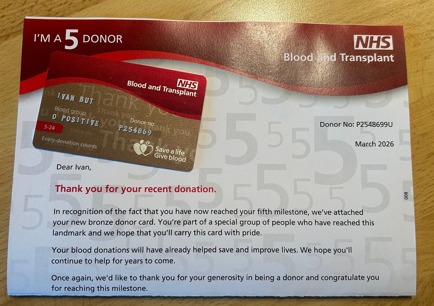 Продолжу популяризировать сдачу крови — недавно я сдал кровь в пятый раз и мне подарили бронзовую карточку! Теперь могу сдавать кровь в бизнес-классе.