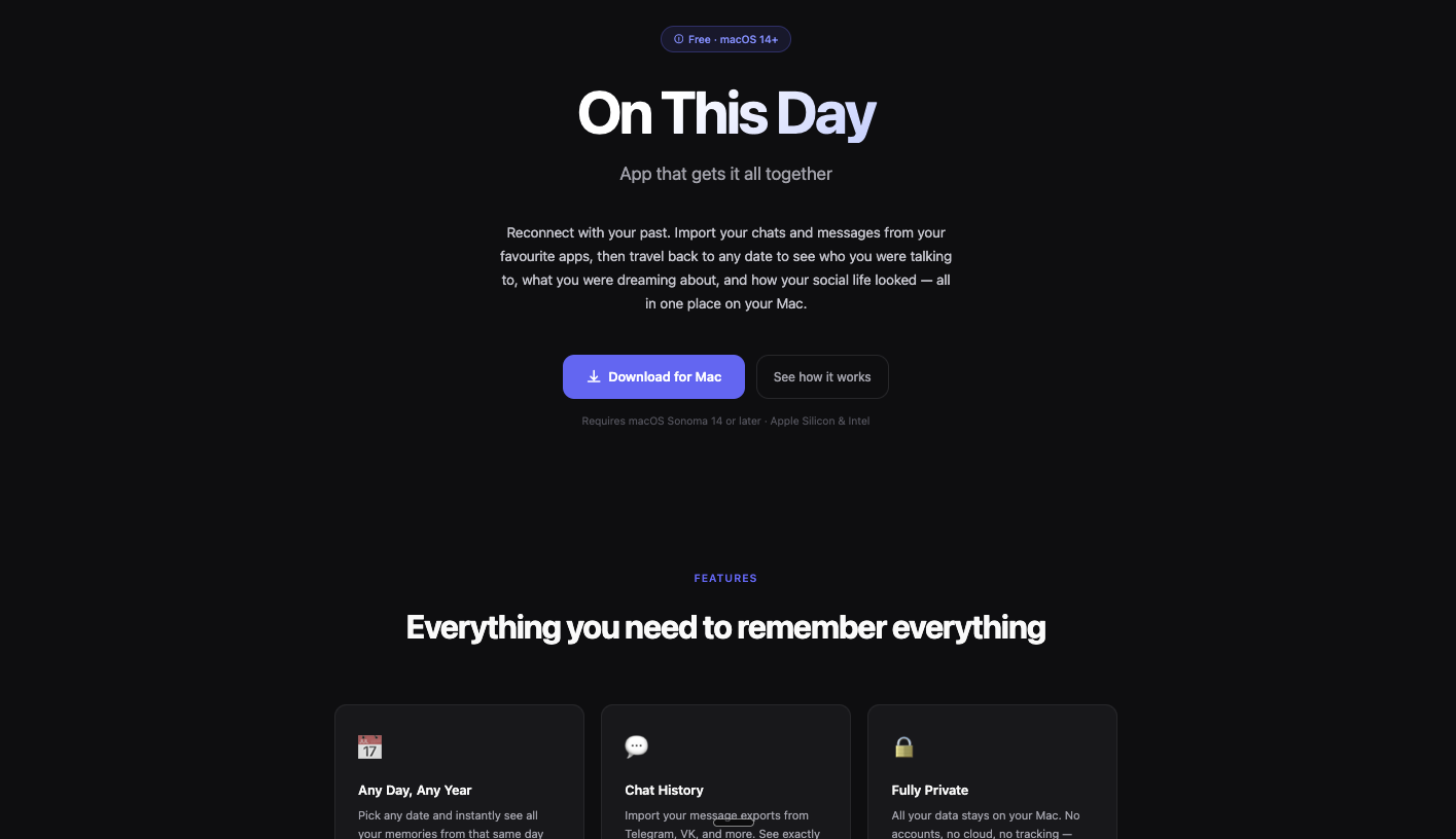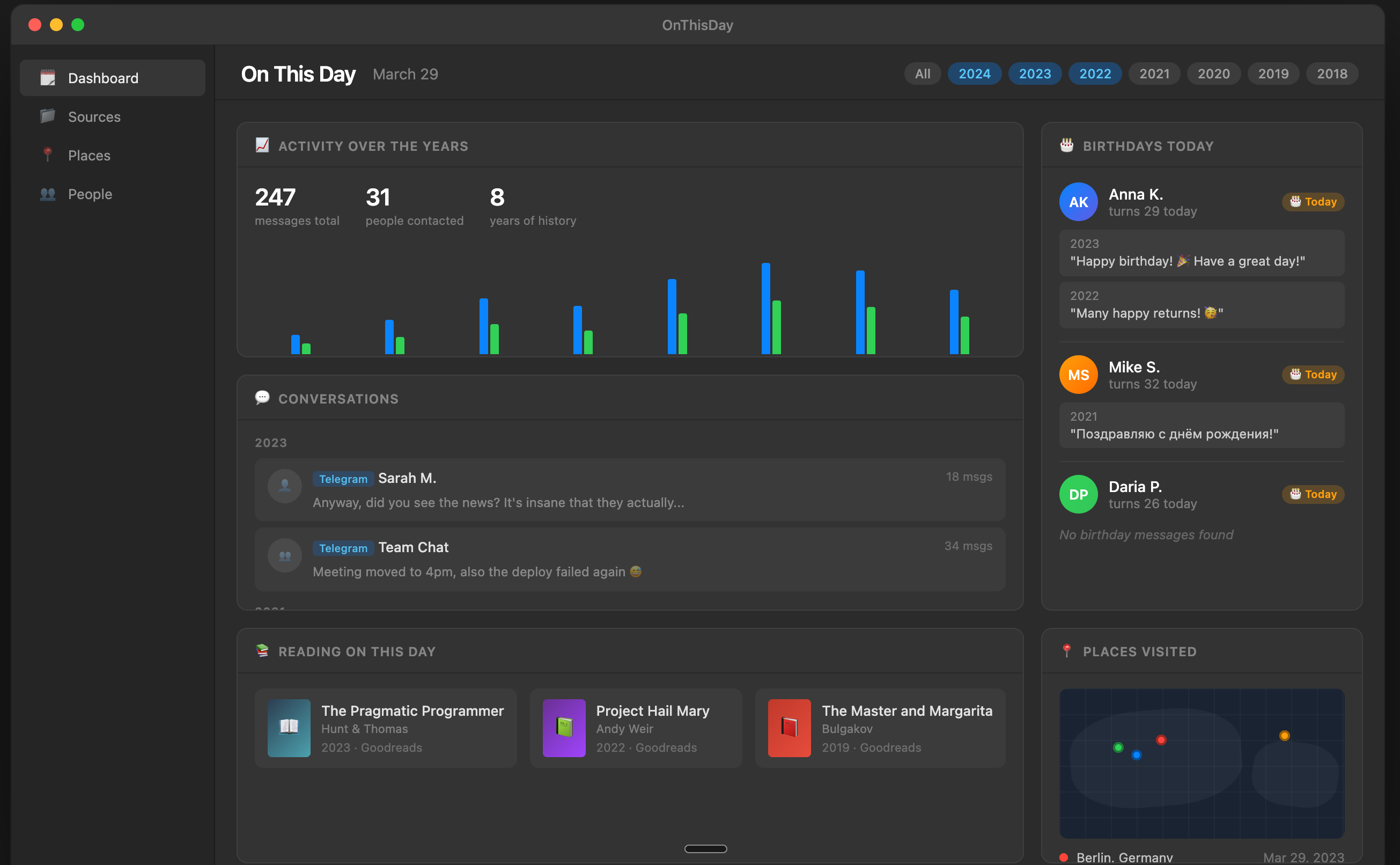 Я сейчас развлекаюсь с небольшим pet-проектом: делаю приложение, которому можно скормить выгрузки из соцсетей, карт, книжных полок и прочих сервисов и получить красивое саммари о том, где ты был в этот день в прошлые годы, с кем болтал, чем вдохновлялся и т.д.
